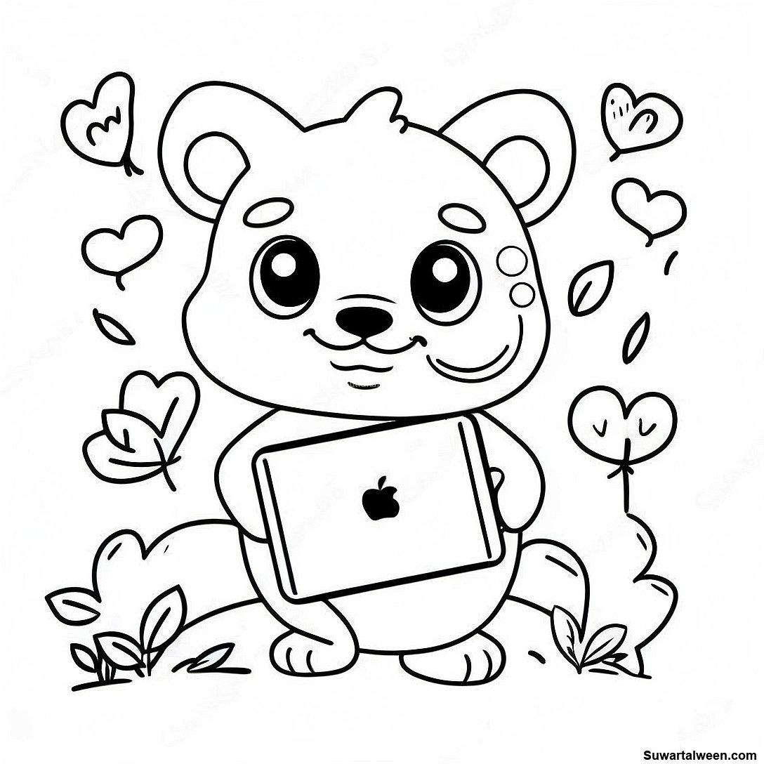 قم بتنزيل PDF القابل للطباعة لـ صفحة تلوين آيباد مع ملصقات الحيوانات اللطيفة