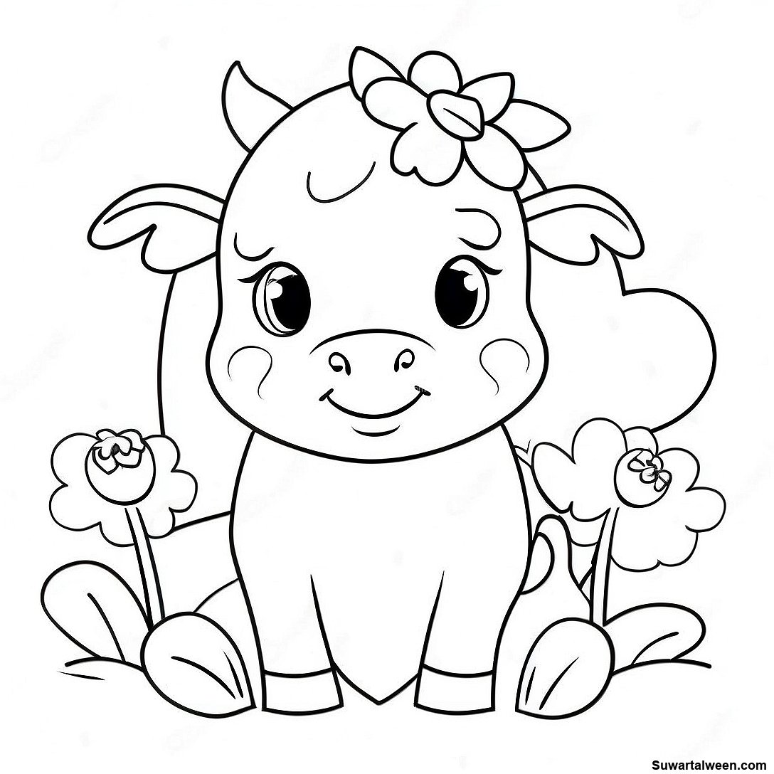 قم بتنزيل PDF القابل للطباعة لـ صفحة تلوين بقرة الفراولة المحبوبة مع الزهور