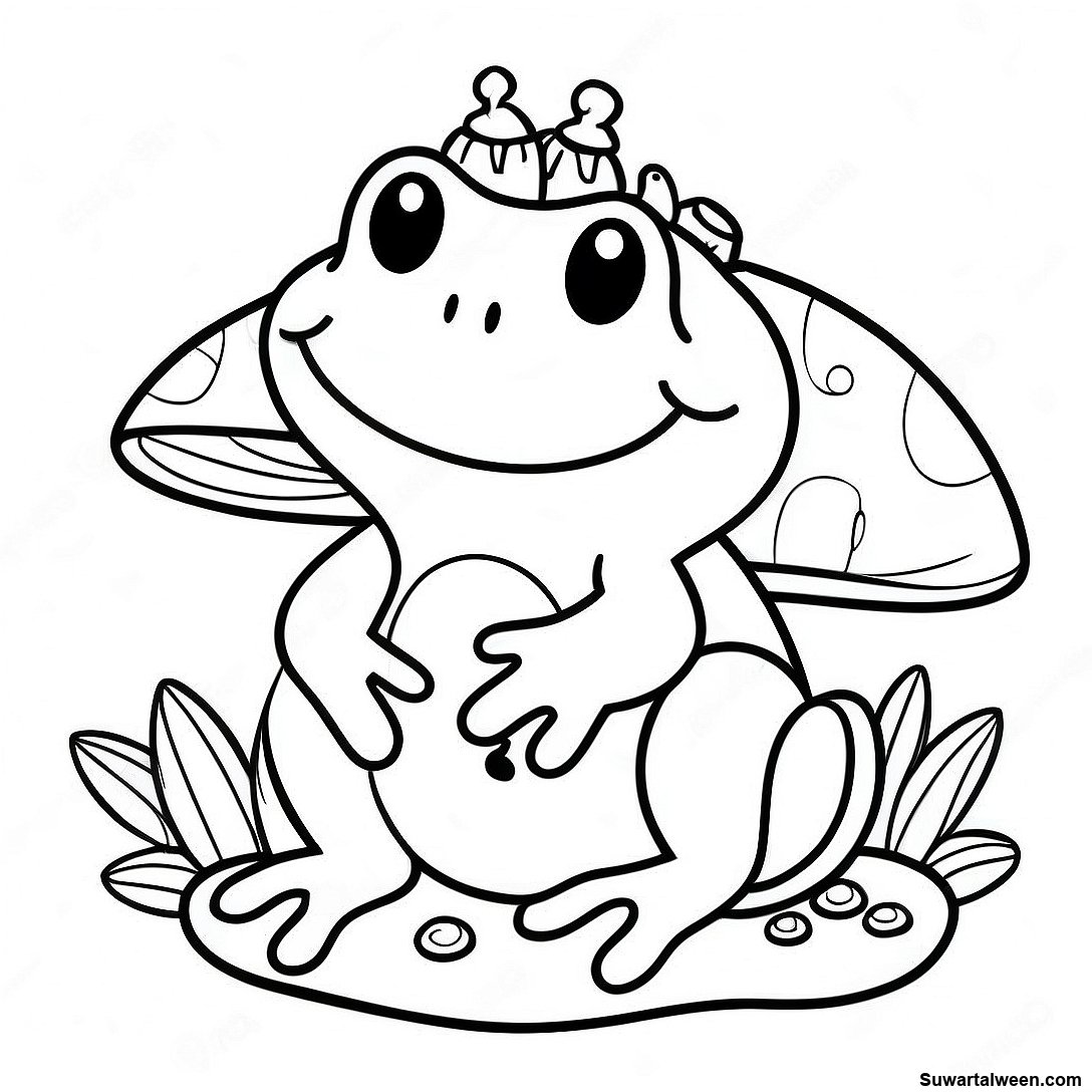 قم بتنزيل PDF القابل للطباعة لـ صفحة تلوين ضفدع سعيد جالس على فطر