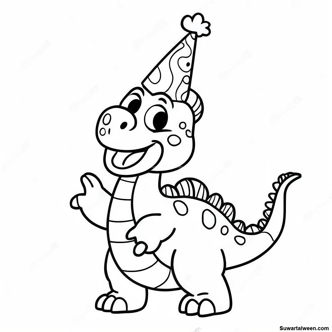 قم بتنزيل PDF القابل للطباعة لـ صفحة تلوين ديناصور سعيد مع قبعة حفلة