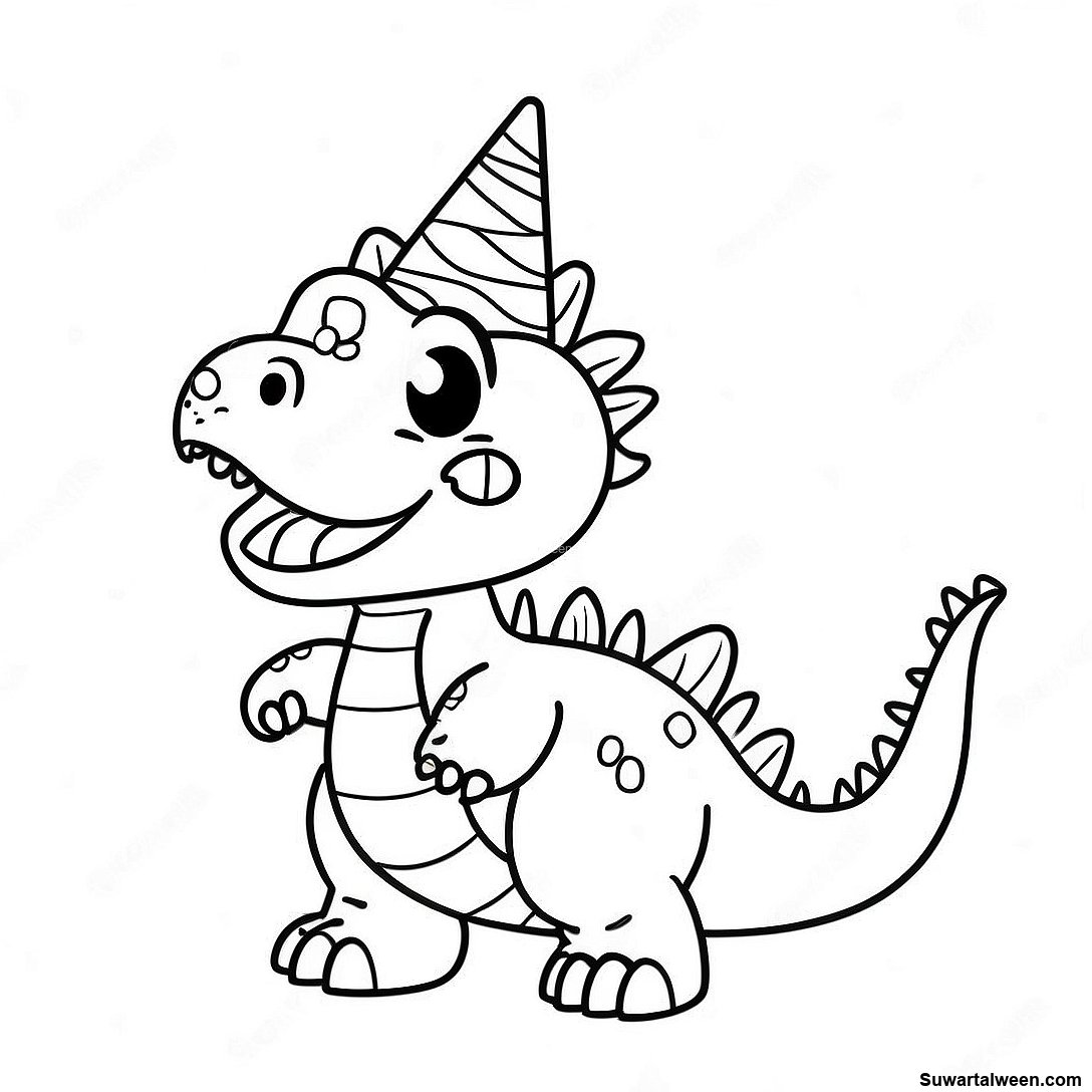 صفحة تلوين ديناصور سعيد مع قبعة حفلة