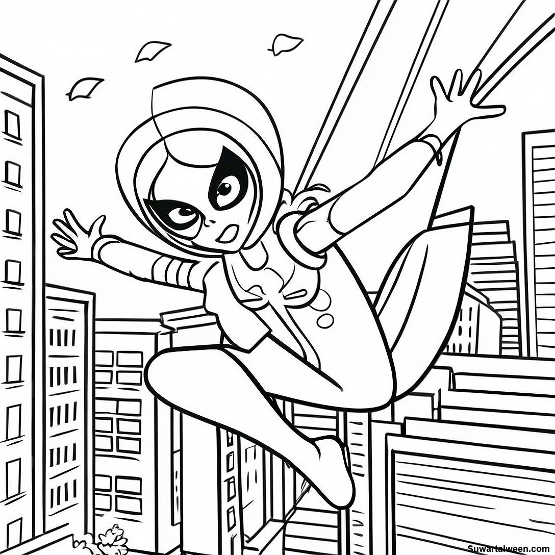 قم بتنزيل PDF القابل للطباعة لـ صفحة تلوين فتاة العنكبوت تتأرجح في المدينة