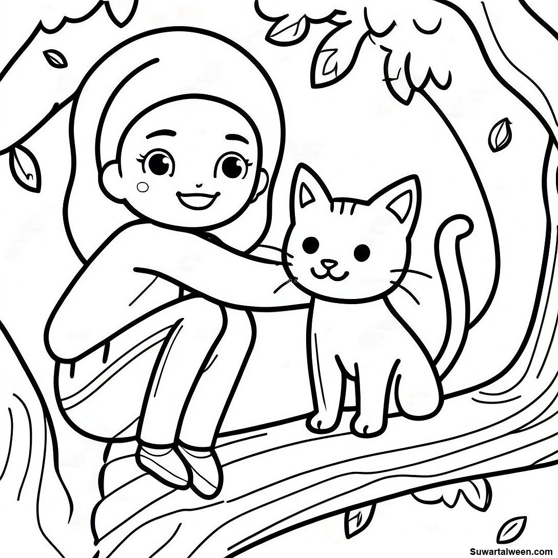 قم بتنزيل PDF القابل للطباعة لـ صفحة تلوين فتاة مغامرة مع قطة في شجرة