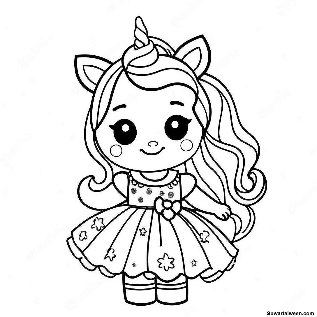 صفحة تلوين فتاة وحيدة القرن بفستان متلألئ