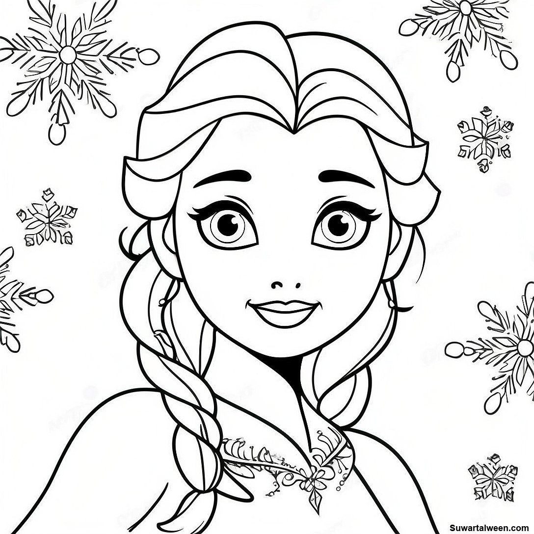 قم بتنزيل PDF القابل للطباعة لـ صفحة تلوين إلسا مع رقاقات الثلج المتلألئة
