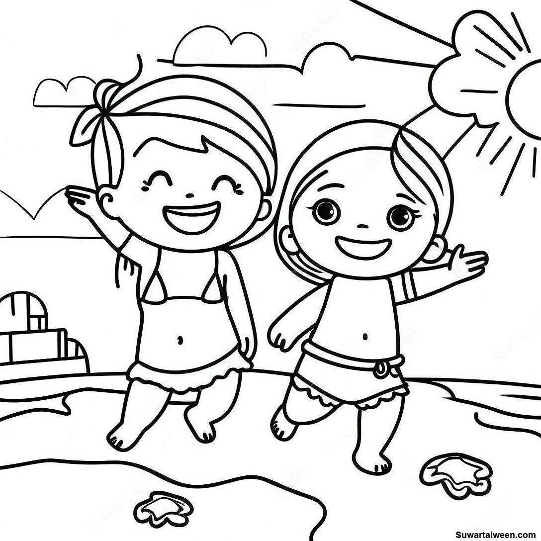 قم بتنزيل PDF القابل للطباعة لـ صفحة تلوين الأطفال الفرحين على الشاطئ