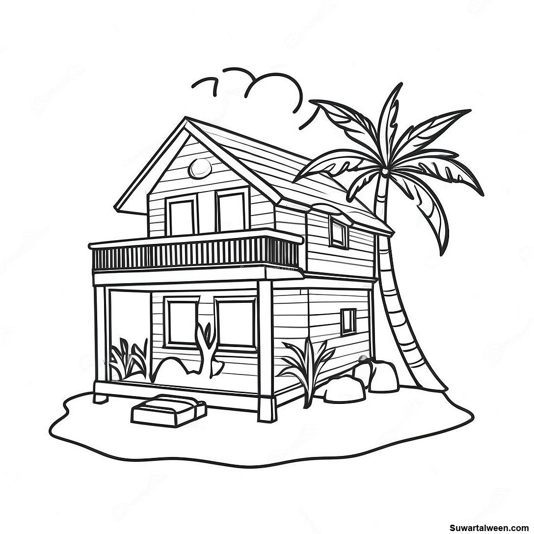 قم بتنزيل PDF القابل للطباعة لـ صفحة تلوين منزل على الشاطئ مشمس
