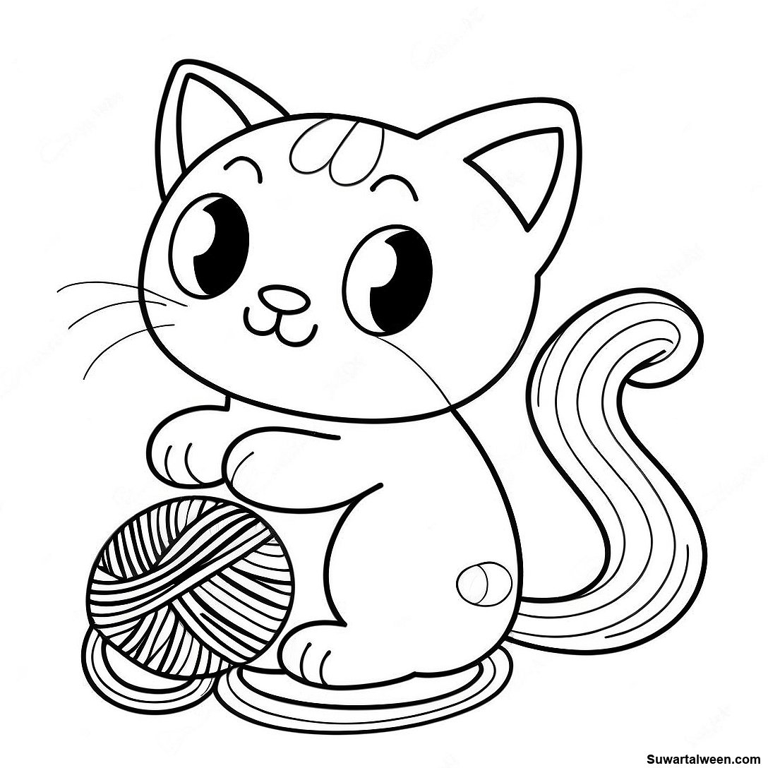 قم بتنزيل PDF القابل للطباعة لـ صفحة تلوين قطة كرتونية لطيفة مع خيط
