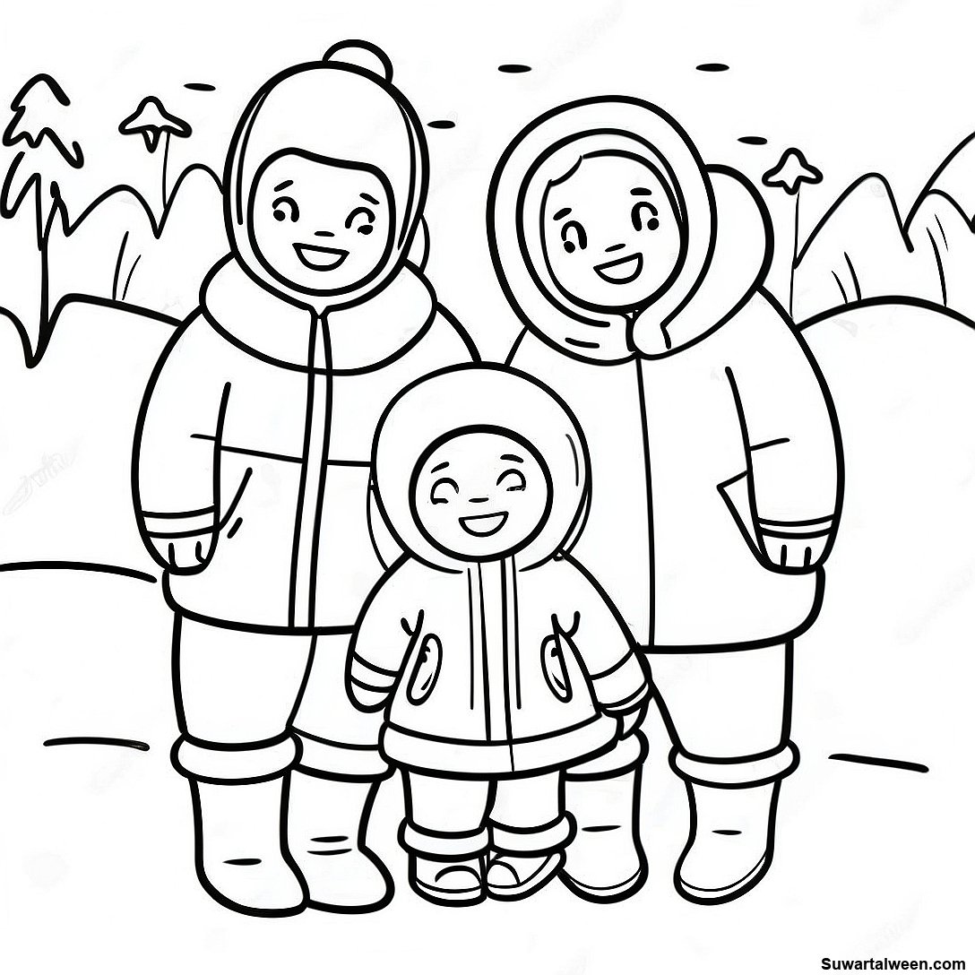صفحة تلوين عائلة إسكيمو في ملابس شتوية